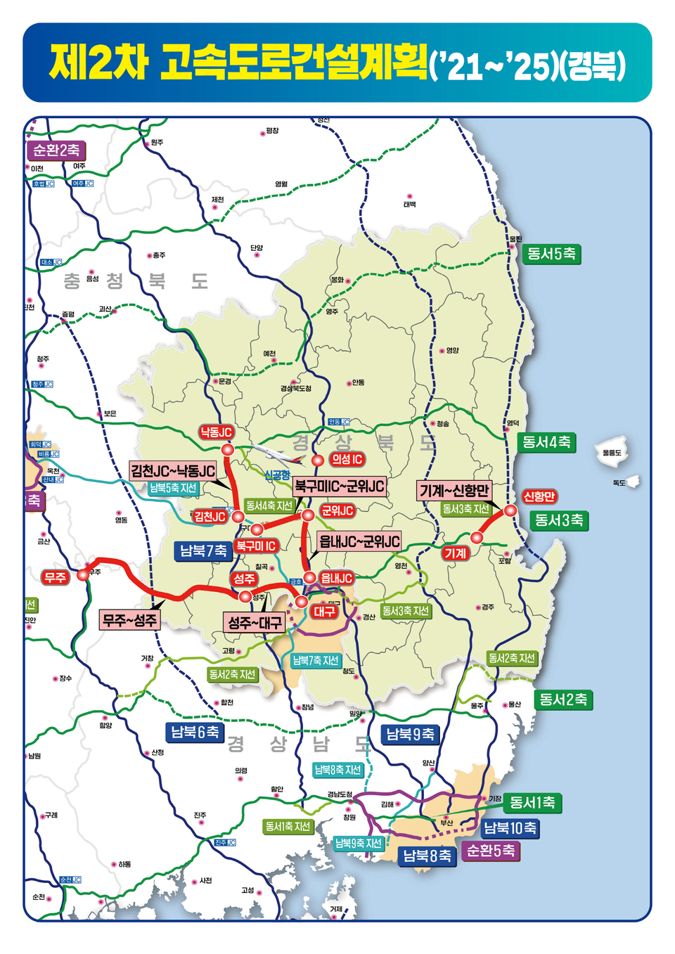 이 중 성주지역 산업단지와 대구지역 산업단지 간 물류수송 및 중부내륙권과 대구권·동해안권 교통소통 원활을 위한 성주~ 대구 고속도로 (18.3km 총사업비 7916억원)와 동서3축 새만금~포항 고속도로의 연결 및 영·호남 상생 교류를 위한 무주~성주 고속도로(68.4km 총사업비 3조4144억원)는 대선공약에 반영돼 사업추진에 탄력을 받을 것으로 기대된다.