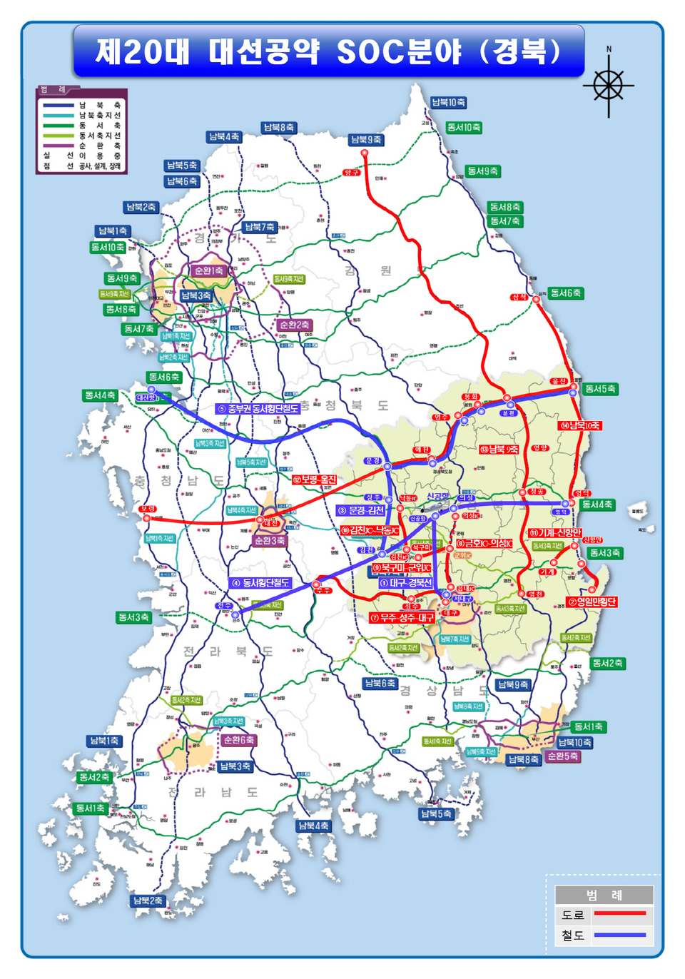 또 추가검토사업 중에서도 중부내륙과 남부내륙철도를 연결하는 십자축 물류교통망 구축과 동서횡단 통항신공한 접근성 확보, 동서화합과 영호남 관광자원의 연계를 위하여 전주~김천~신공항~의성~영덕을 연결하는 동서횡단철도(215km, 5조1471억원)와 경북·충남·충북 도청 소재지 연계로 광역 행정축을 형성하고 동해안 에너지·관광벨트와 서해안 신산업벨트를 연결하는 중부권 동서횡단(충남 서산~충북~경북울진)철도(322.4km, 4조7824억원), 지난 제3차 국가철도망 구축계획에 반영돼 추진 중인 남부내륙철도(김천~거제) 등도 대선공약에 반영돼 조기에 착공 될 것으로 기대된다.
