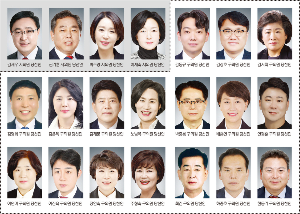 물갈이도 대폭 이뤄졌다. 민선 7기 동구의회에서 활동했던 구의원 가운데 5명 만이 생존했다. 동구 가선거구 주형숙 구의원과 동구 다선거구 이연미 구의원, 동구 라선거구 노남옥·김상호 구의원, 동구 바 선거구 정인숙 구의원만이 재선 타이틀을 획득했다. 다른 12명의 당선인은 모두 초선이다.