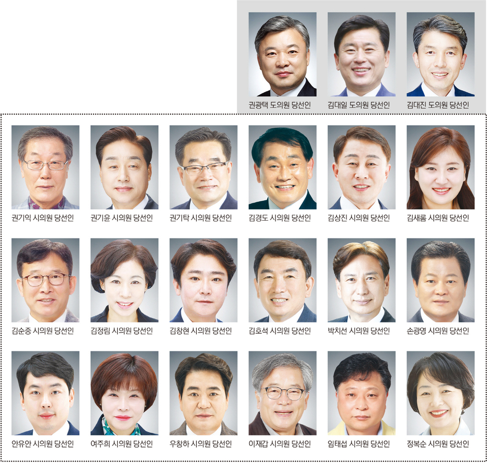 나 선거구(옥동)는 국민의힘 권기윤(59) 후보가 3200표(38.92%), 더불어민주당 정복순(54·여) 후보가 2100표(25.54%)를 얻어 각각 당선됐다.
