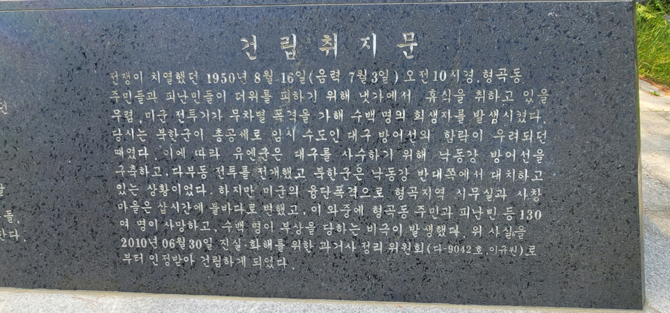 폭격이 있었던 1950년 8월 16일 마을주민은 평소와 다름없이 밭일을 하거나 쉬면서 일상생활을 보냈고, 피란민은 형곡 냇가에서 더운 날씨를 피할 수 있는 하얀 천으로 천막을 쳐 놓고 있었다.