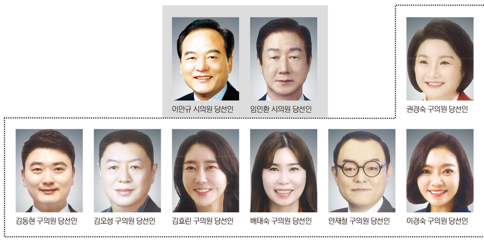 기초의원 선거는 비례대표 1명 포함, 총 7명이 나왔으며 이 중 국민의힘 소속은 5명, 민주당 소속은 2명이다.