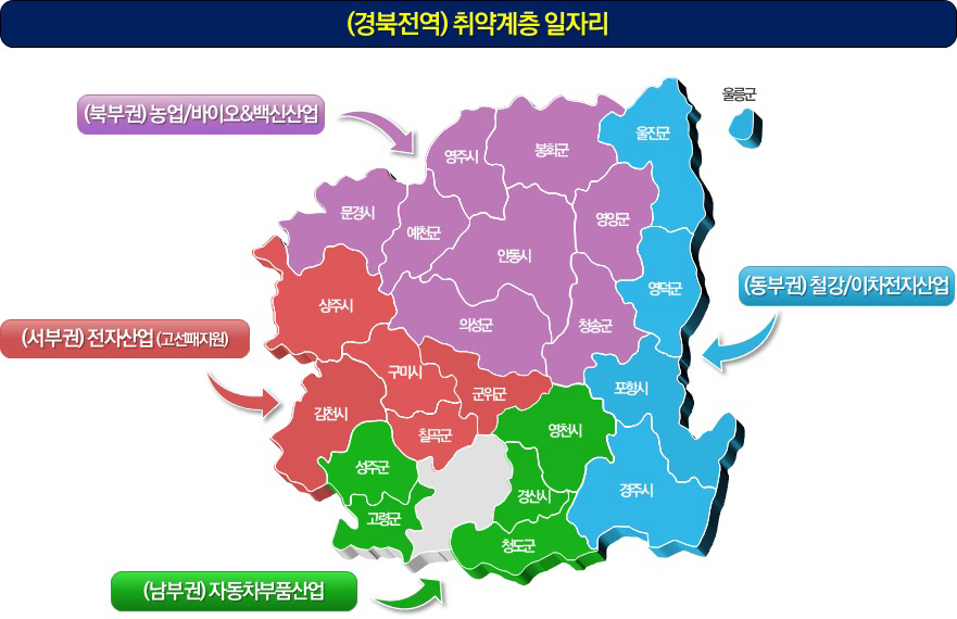 이에 경북도는 지역 산업구조 변화 및 주력산업의 구조조정 등에 대응해 지역의 다양한 인적·물적 자원을 활용해 지역의 일자리 창출 및 질 개선을 도모하는 다양한 일자리 정책을 추진하고 있다.