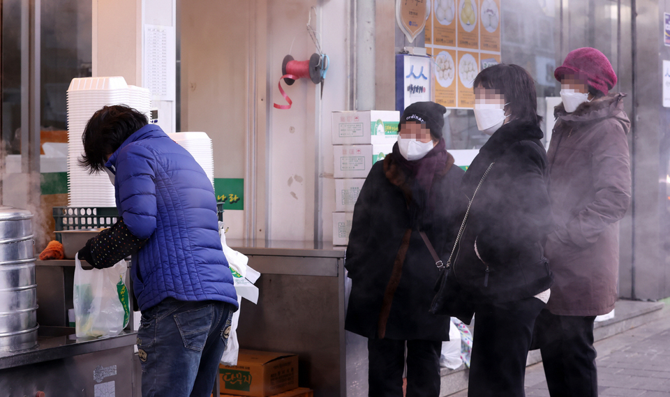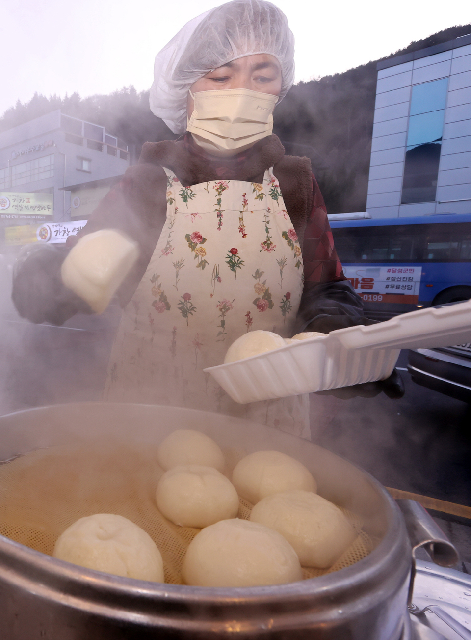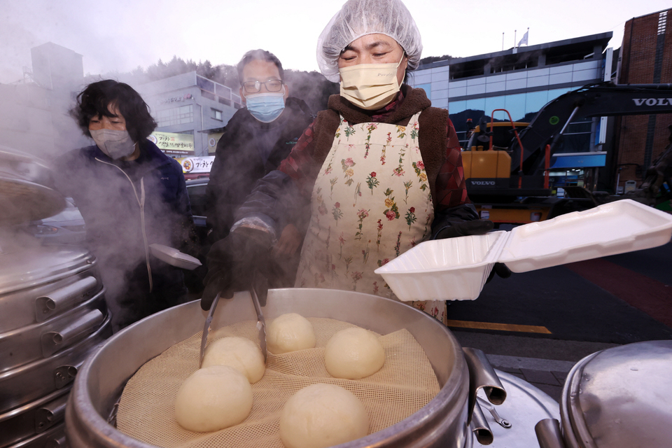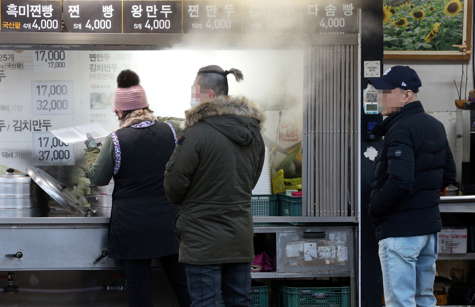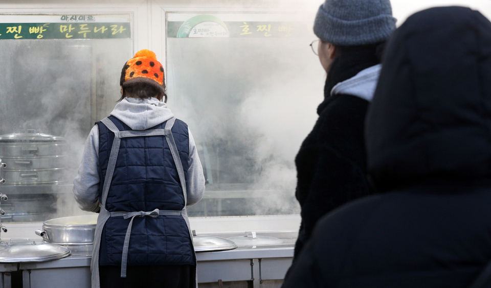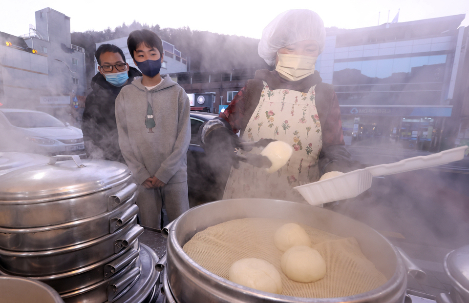 5일 오후 대구 달성군 가창면 찐빵골목에 한 상인이 찐빵을 담아내고 있다. 이날 최저기온은 영하 5.2도를 기록했다.
