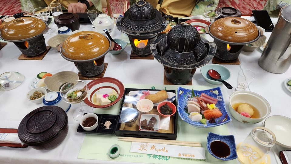 저녁 메뉴는 일본 전통 ‘가이세키요리(會席料理)’가 나왔다. 작은 그릇에 다양한 음식이 순차적으로 나오는 일본의 연회용 코스요리를 일컫는 ‘가이세키요리’가 한상 가득 차려져 있다. 가이드가 먹는 방법을 설명해주고 친절이 몸에 밴 종업원들이 일사불란하게 움직이며 식사를 거든다. 서울 사는 필자의 죽마고우인 김재년 사장이 분위기를 돋우기 위해 산 니혼슈(日本酒)로 후지산 둘레길 트레킹의 성공을 기원하는 건배가 몇 순배 돌다 보니 모두가 기분 좋은 일본에서의 첫 저녁을 즐겼다. 저녁을 마치고 1층 로비에서 벌어지는 민속 북춤 공연까지 관람하고 각자 방으로 들어간다. 새벽 일찍부터 서둘러 하늘길과 육로에서 하루 종일 시달렸지만 오랜만에 맛보는 니혼슈 몇 잔에 모든 피로와 아쉬움이 사라지고 이색적인 다다미방 잠자리가 낯설지 않은 일본에서의 첫 밤을 맞았다.