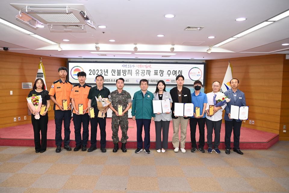 김천시는 지난 8일 김천시청 2층 강당에서 산불방지 유공자 표창 수여식을 열고 김천의 산불 예방 및 방지에 기여한 유공자들에게 표창을 수여했다.