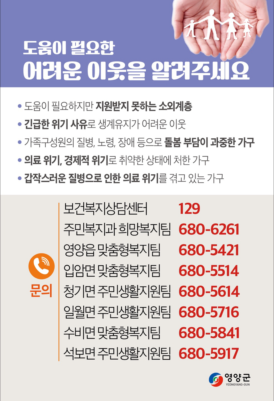 오도창 영양군수는 “스스로 상황을 극복하기 어려운 주민에 대한 관심과 제보가 필요하다”며 “주변 이웃에 세심한 관심을 기울여 주시기 바라며, 단 한 명의 군민도 소외됨이 없도록 앞으로도 군민 곁 가까이 군민이 필요로 하는 복지서비스를 펼쳐 나가겠다”라고 말했다.