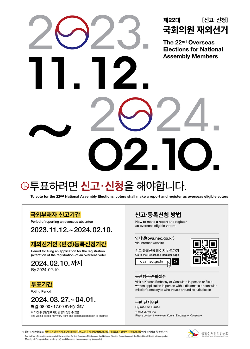다만 지난 선거의 재외선거인명부에 올라있던 유권자는 제22대 국회의원선거 재외선거인 영구명부에 자동으로 등재되므로 별도의 신청 없이 재외선거에 참여할 수 있다.