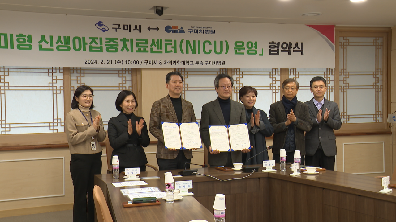 구미시는 오늘(21일) 시청 국제통상협력실에서 고위험 신생아 생존율을 높이기 위해 경북 유일의 ‘구미형 신생아집중치료센터 운영’을 위한 협약을 체결했습니다.